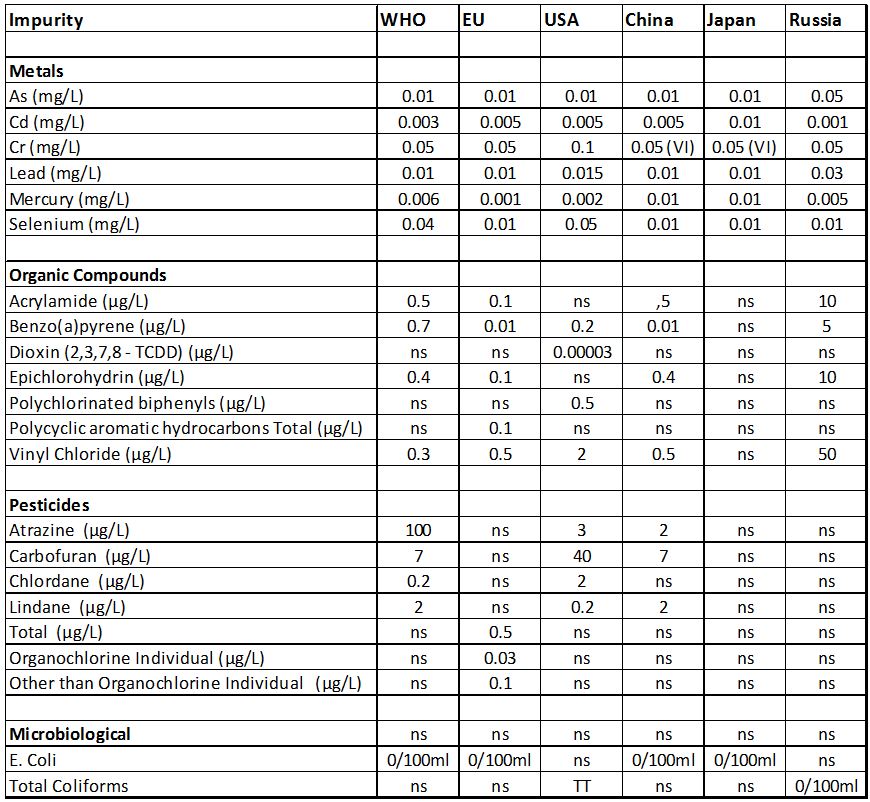 Inorganic impurities often have similar limits. However, only arsenic, cadmium, chromium (VI), lead, mercury and selenium have limits set in all the standards studied. All these toxic impurities are only allowed at sub-ppm levels. The Russian list includes a number of extra metals, perhaps reflecting the higher contamination risks from the former Soviet Union. The WHO has adopted the approach of only including contaminants that are relatively likely to be present at hazardous concentrations; so, for example, no limit is given for cyanide (in contrast to all the other standards) as it is very unlikely to be present. I presume that this is to minimise the burden of testing.